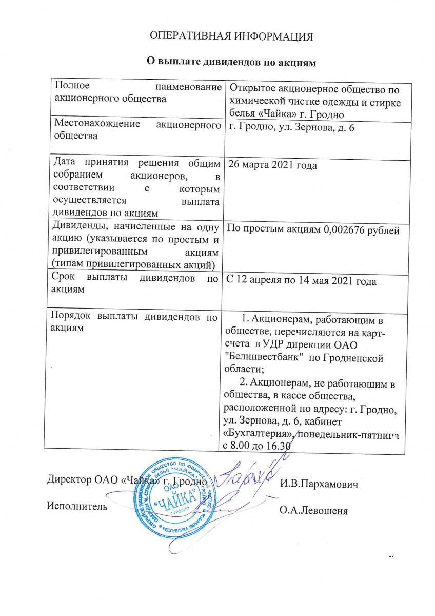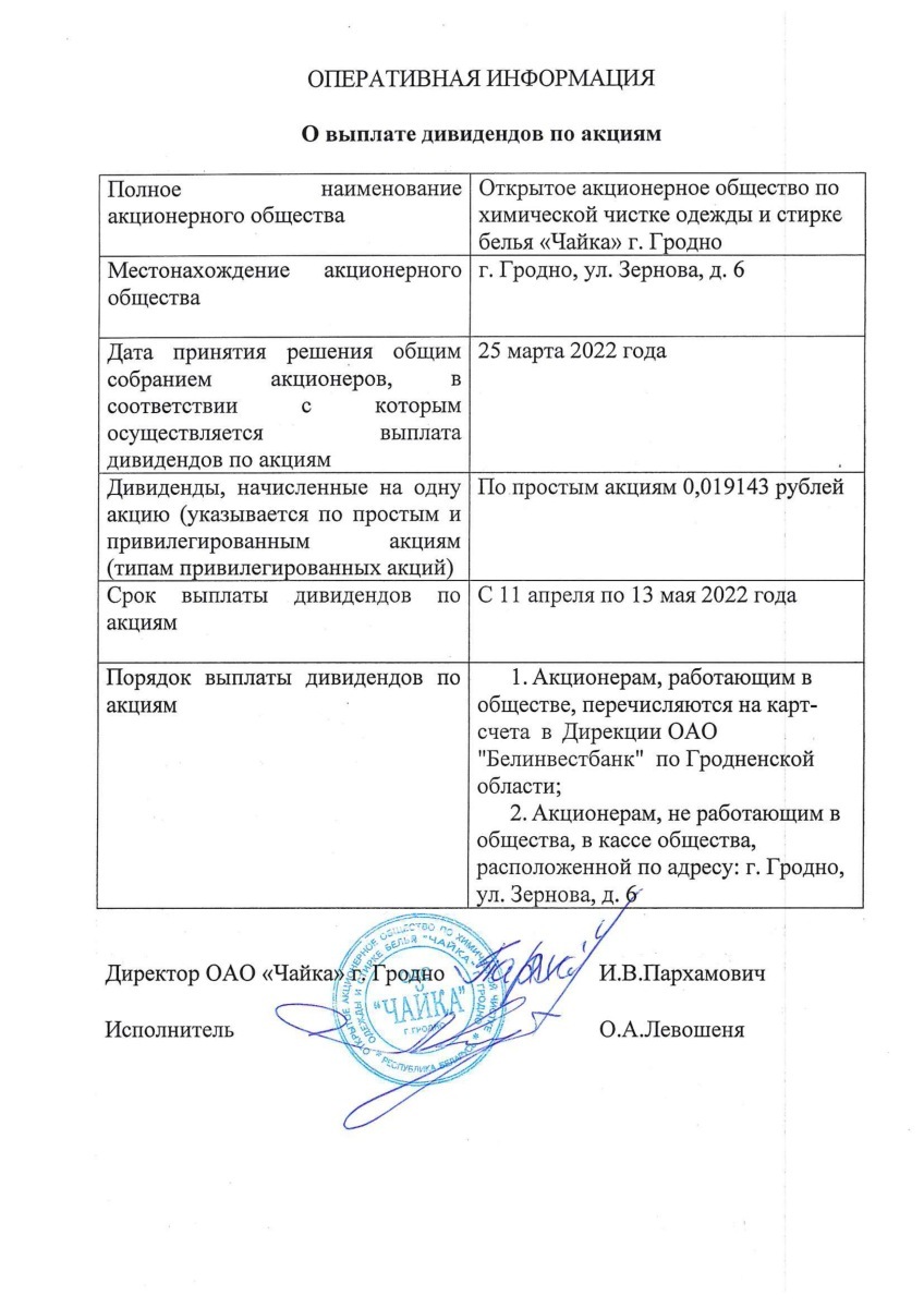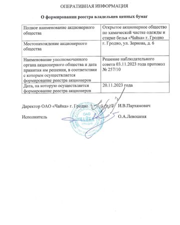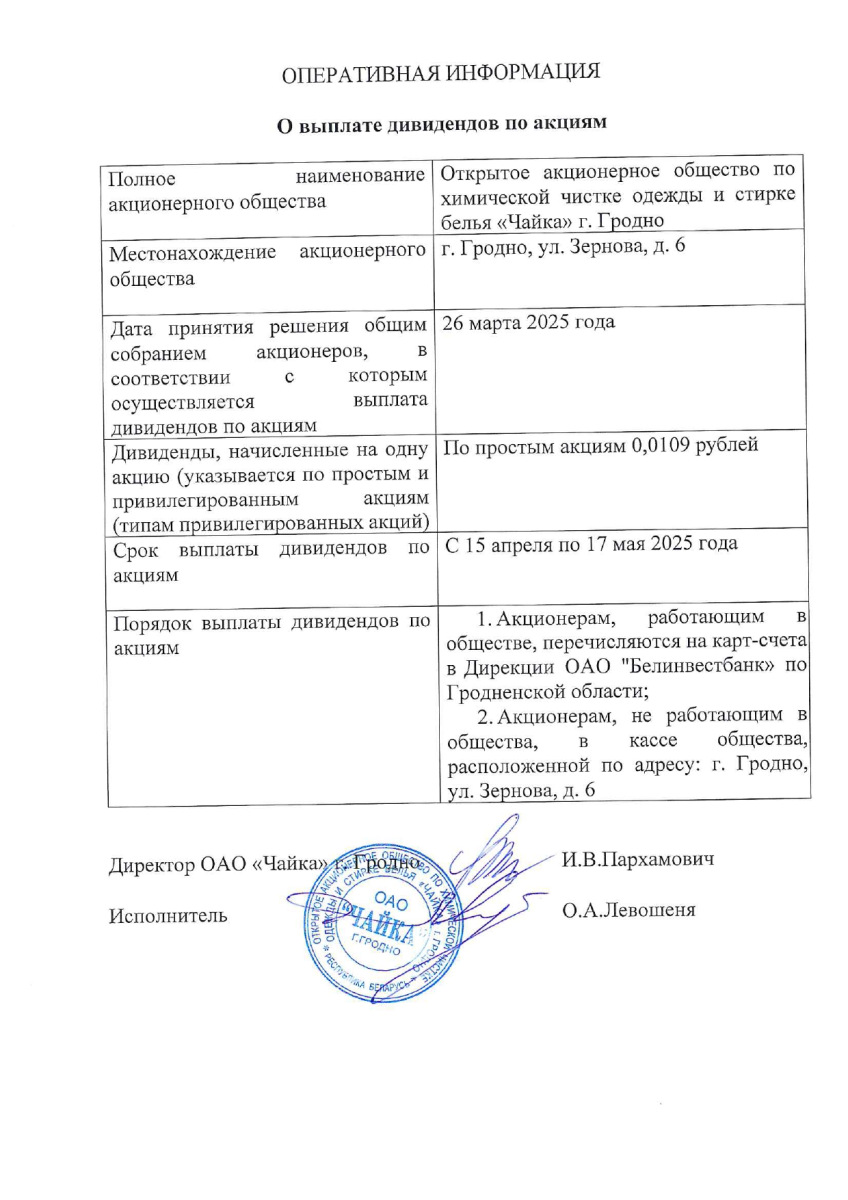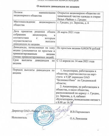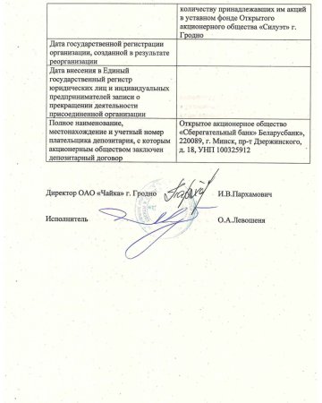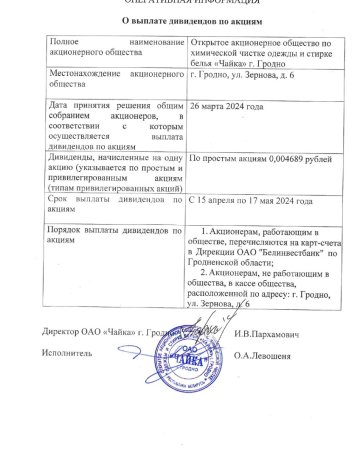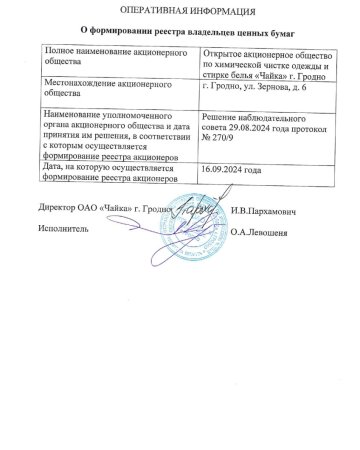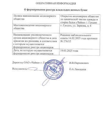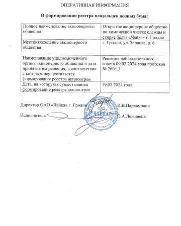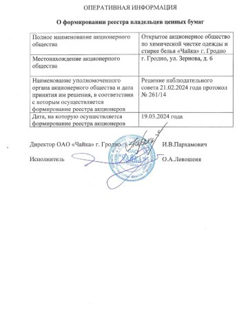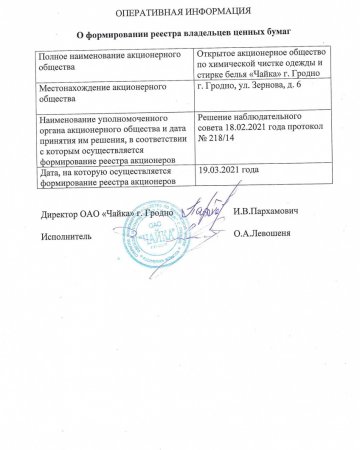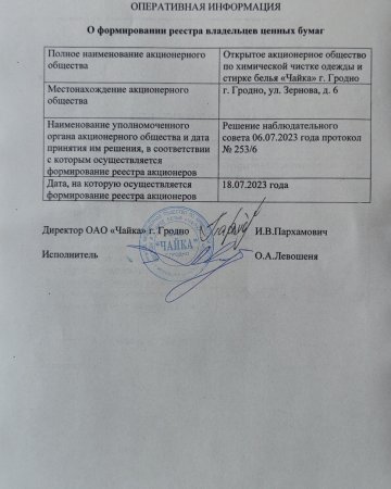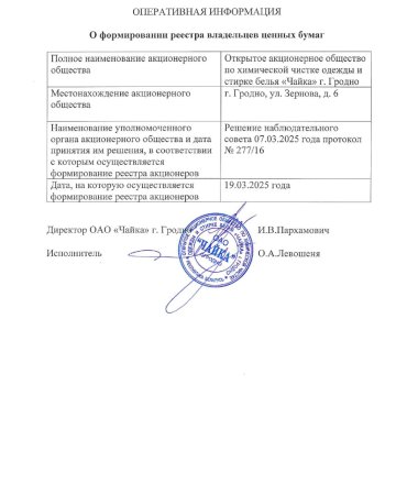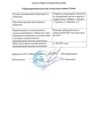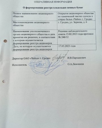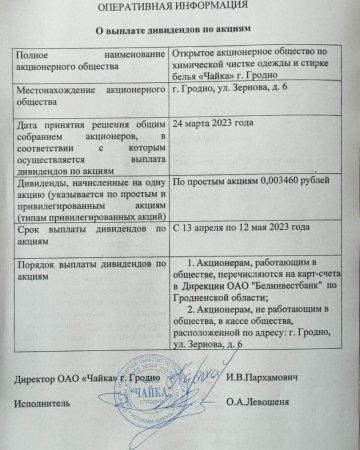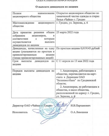 Информация для акционеров ОАО "Чайка" г. Гродно