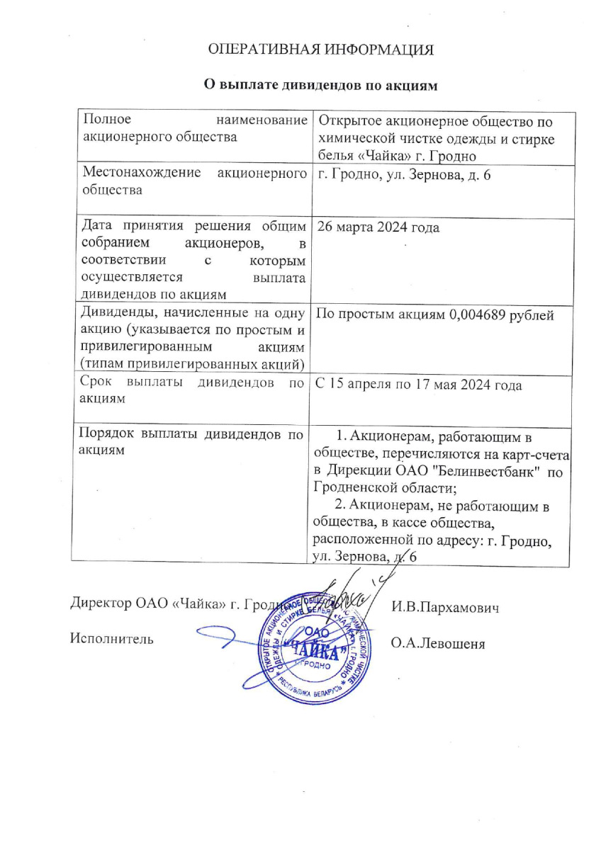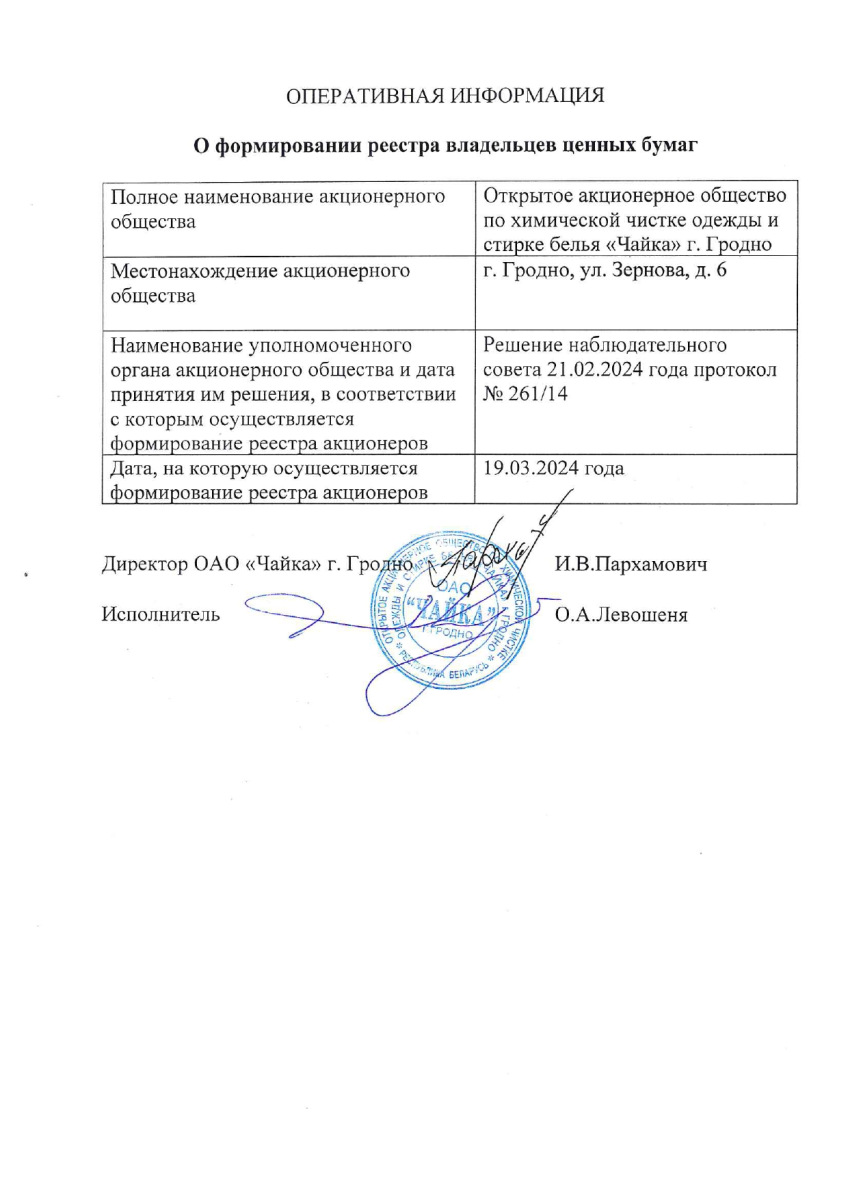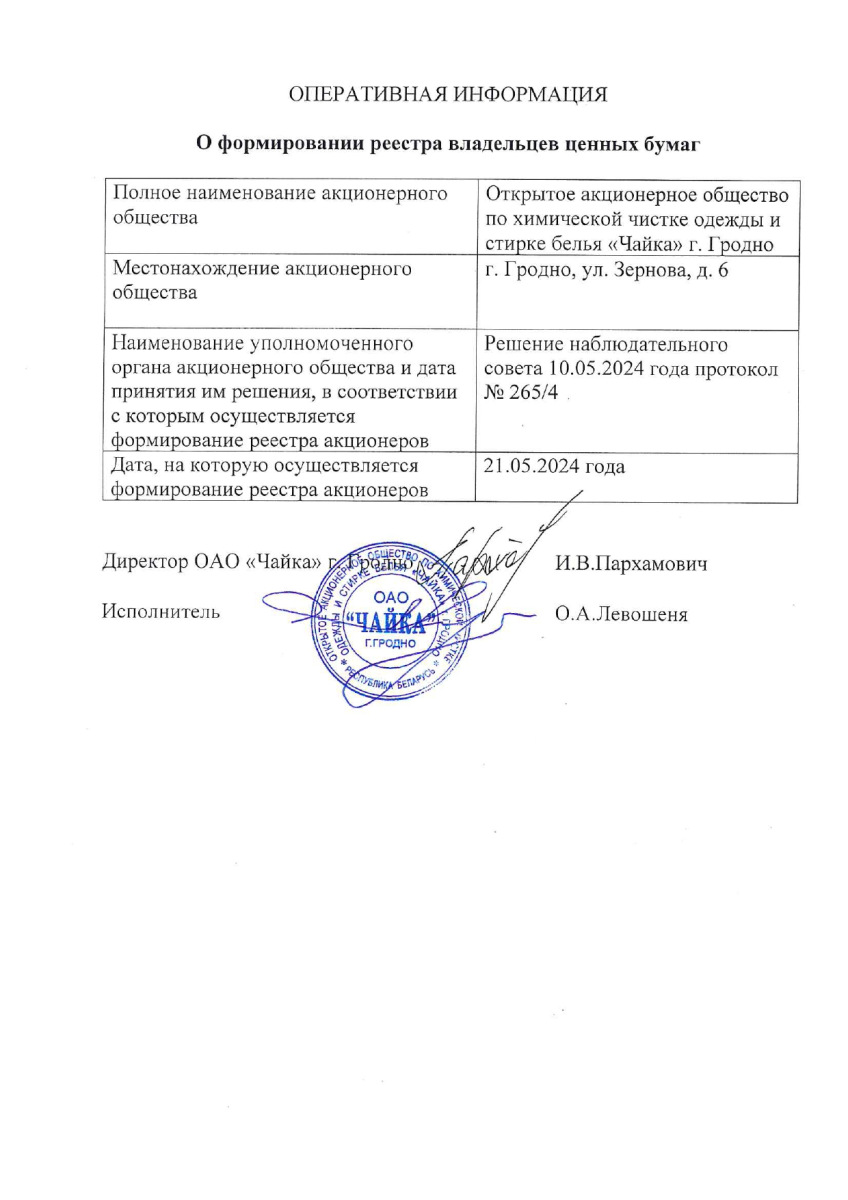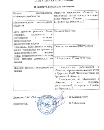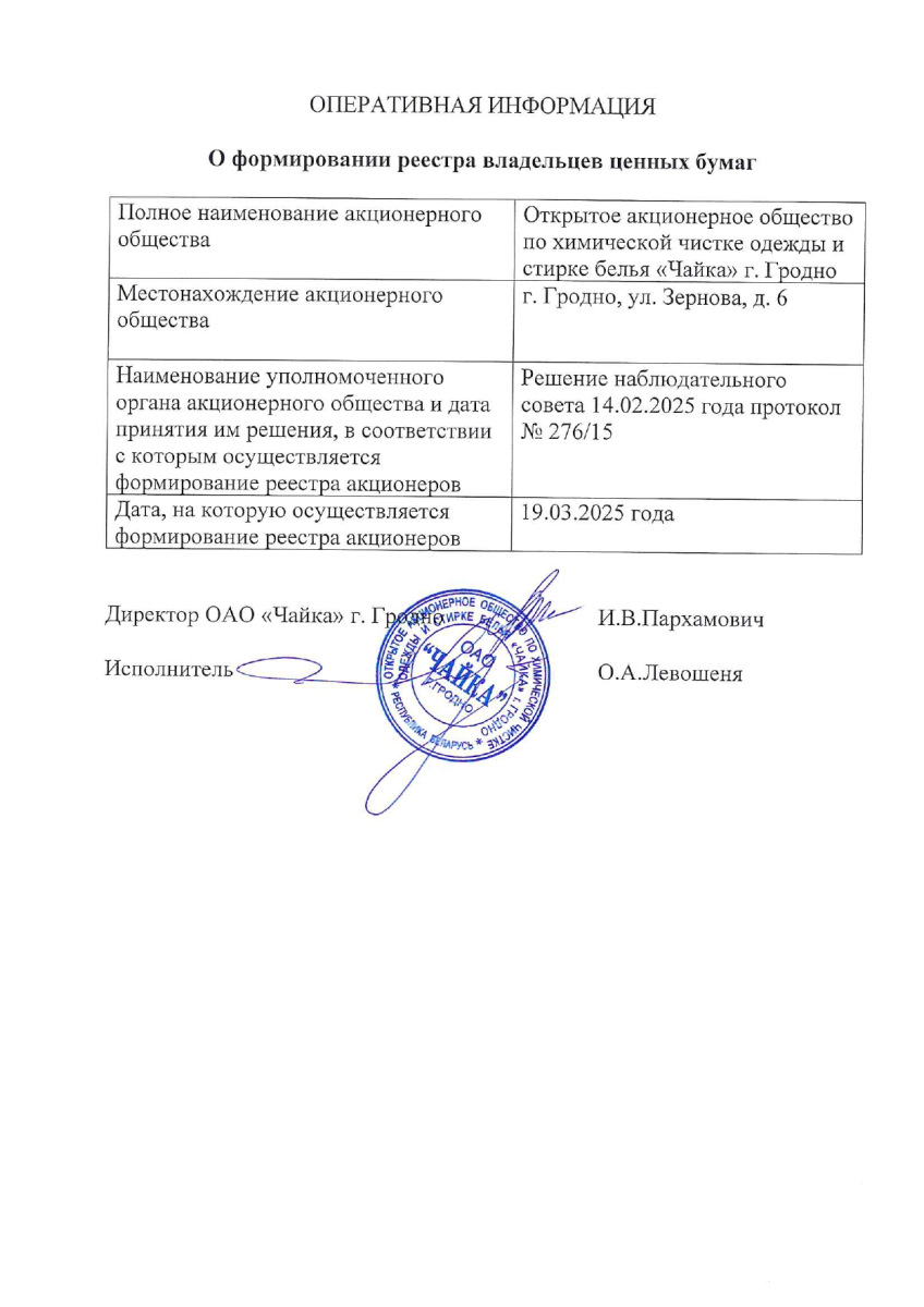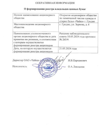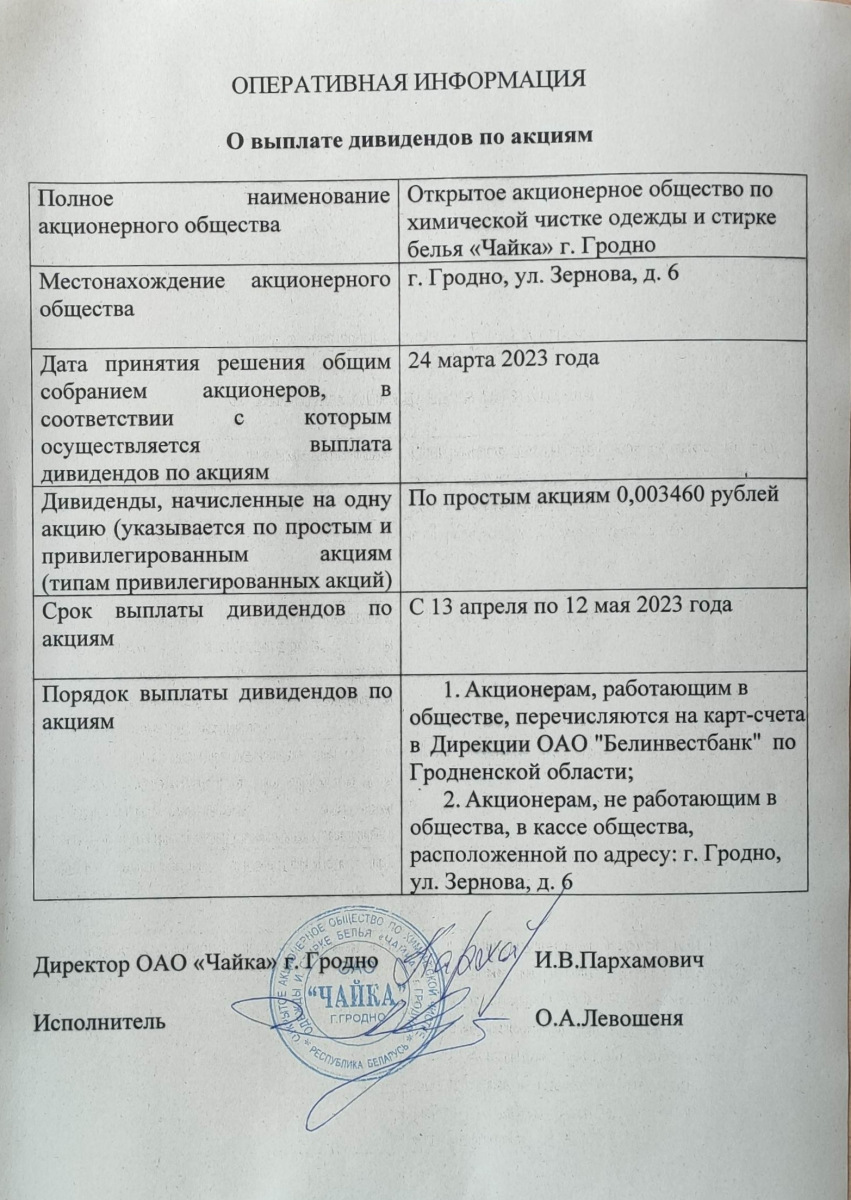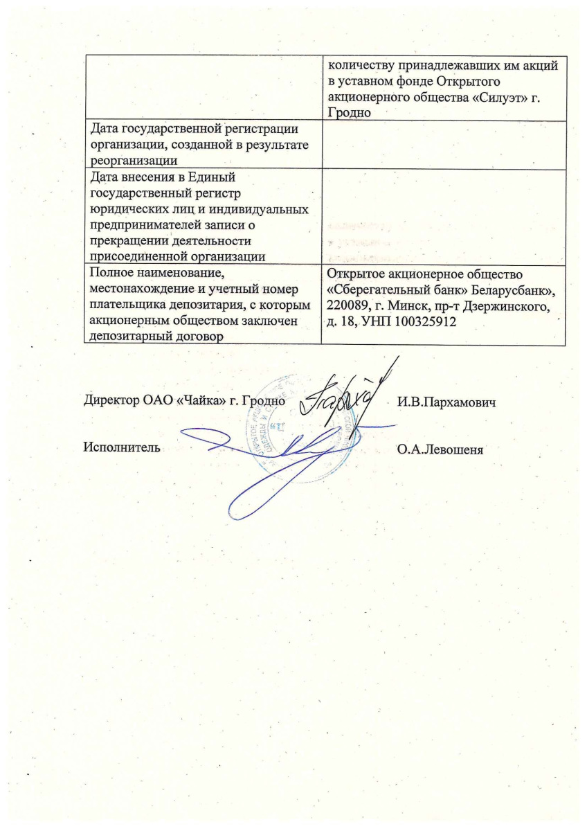 Информация для акционеров ОАО "Чайка" г. Гродно