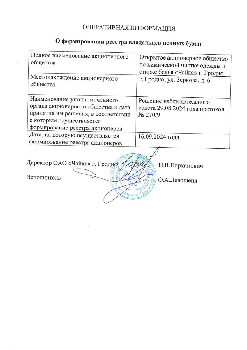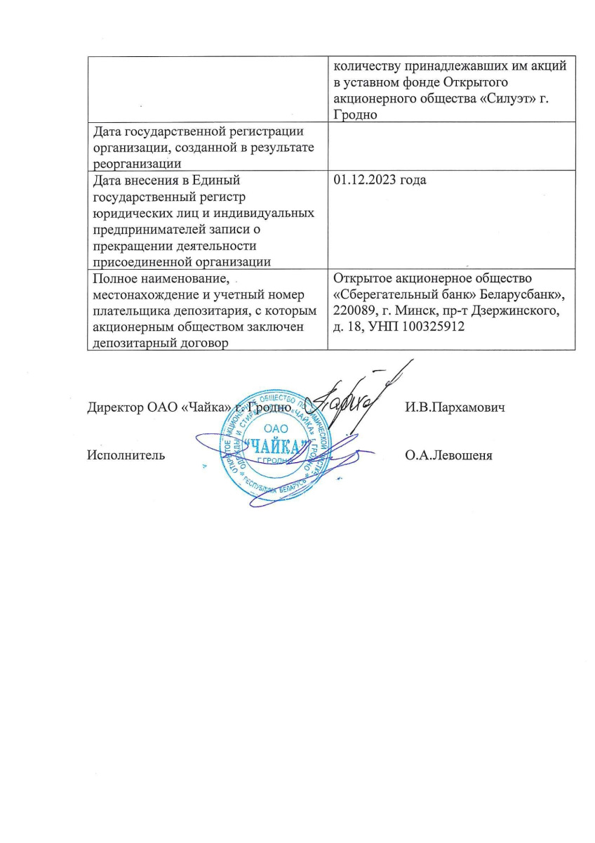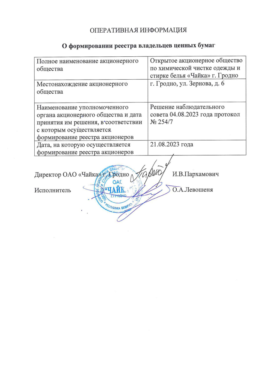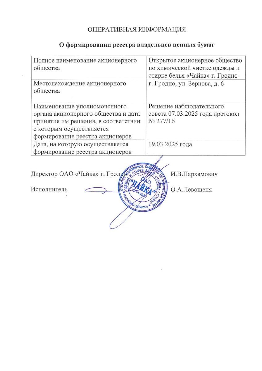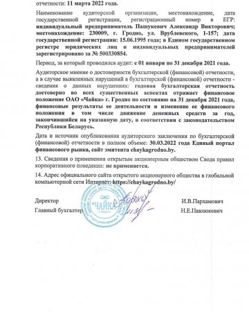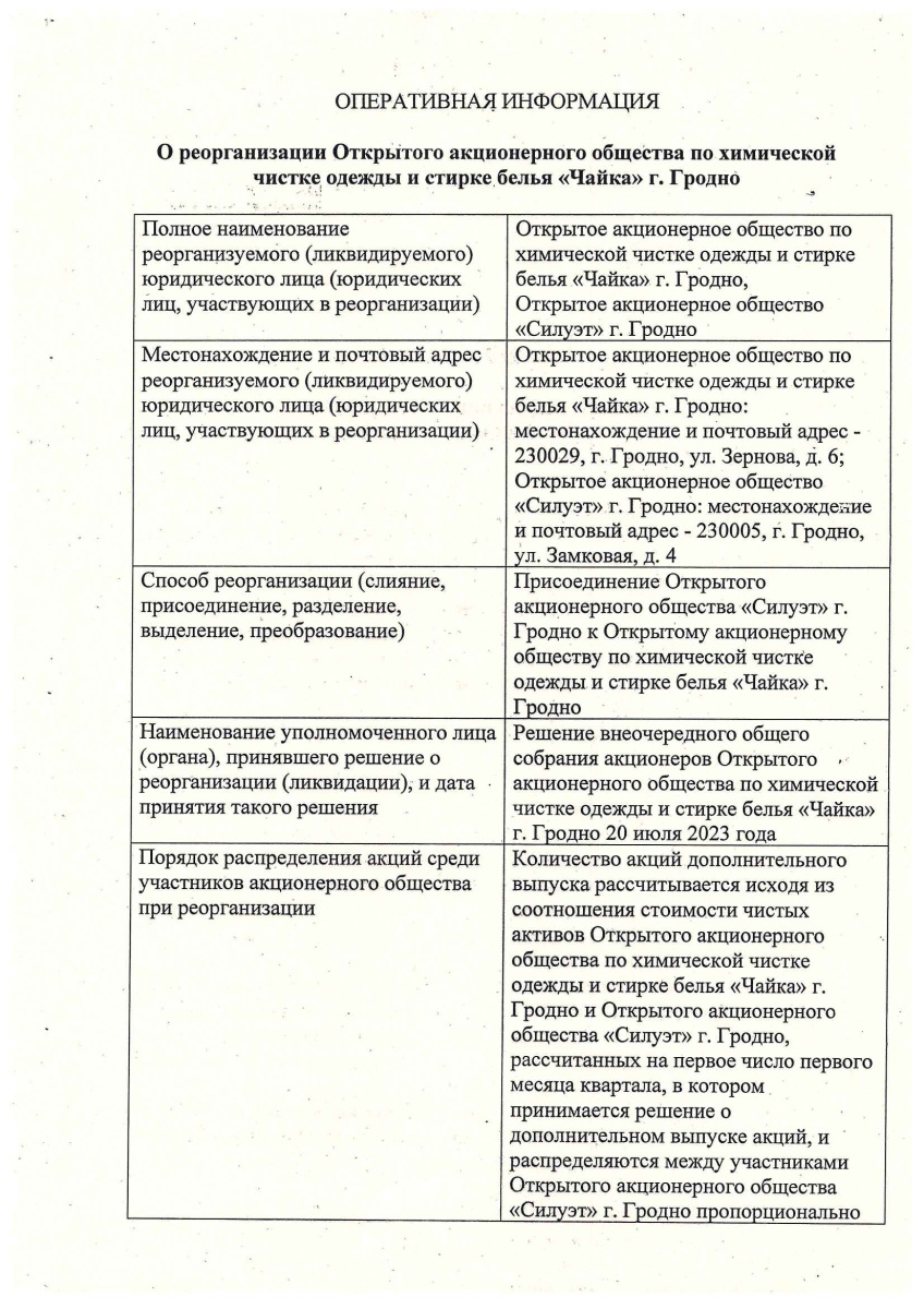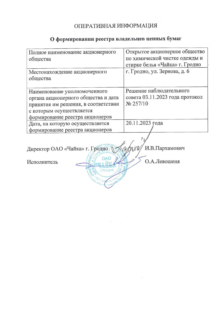 Информация для акционеров ОАО "Чайка" г. Гродно