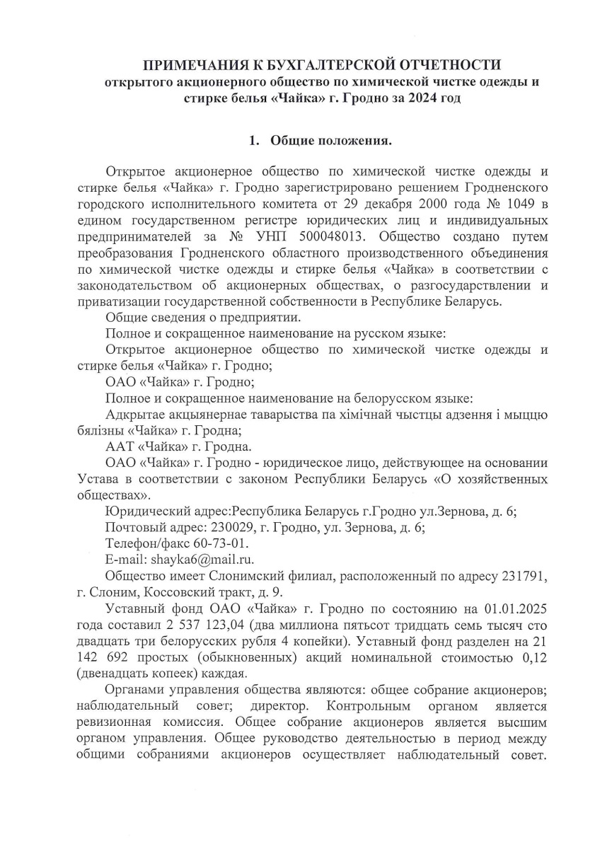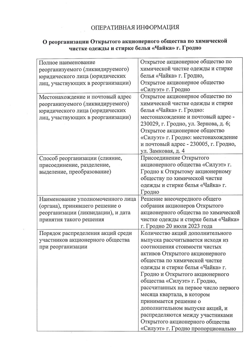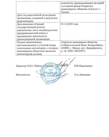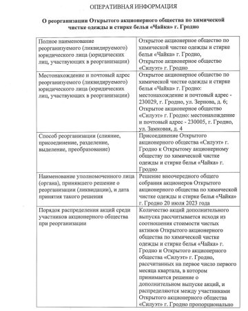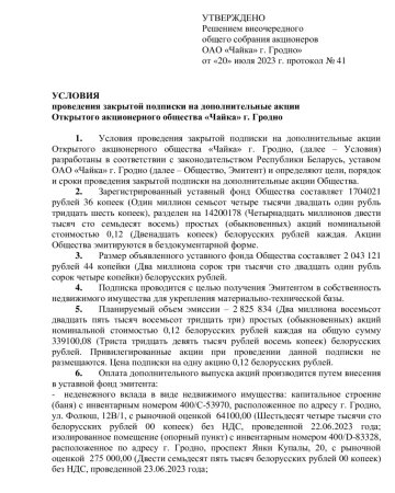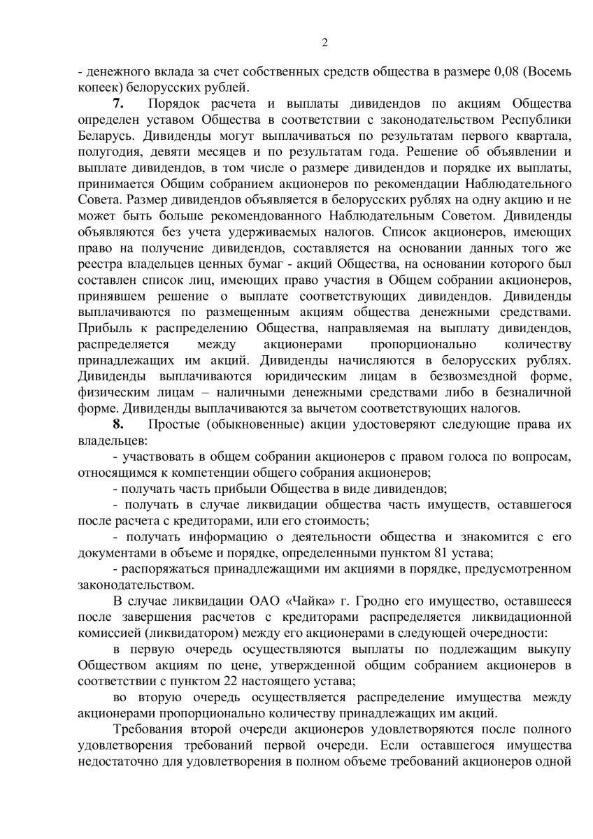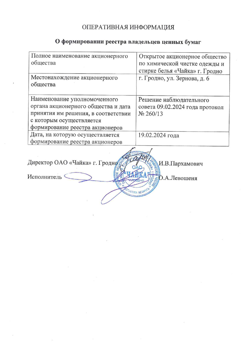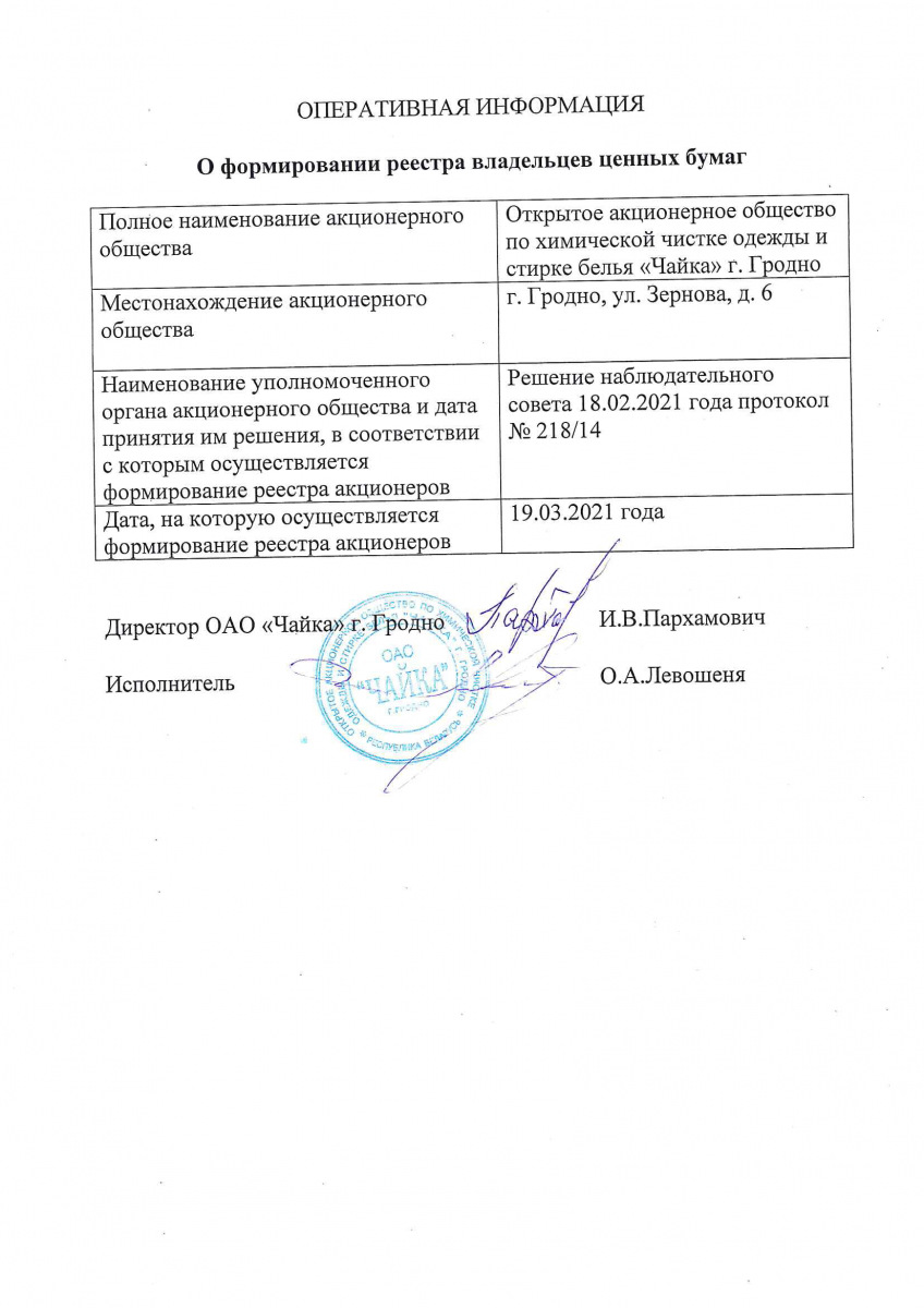 Информация для акционеров ОАО "Чайка" г. Гродно