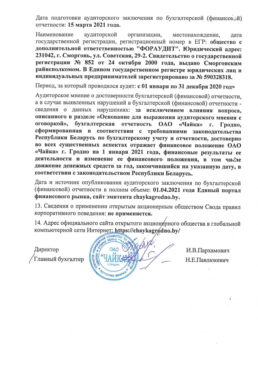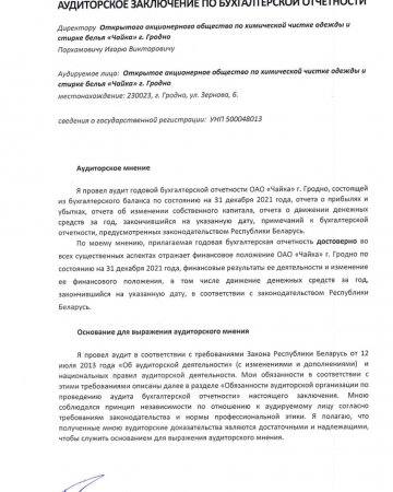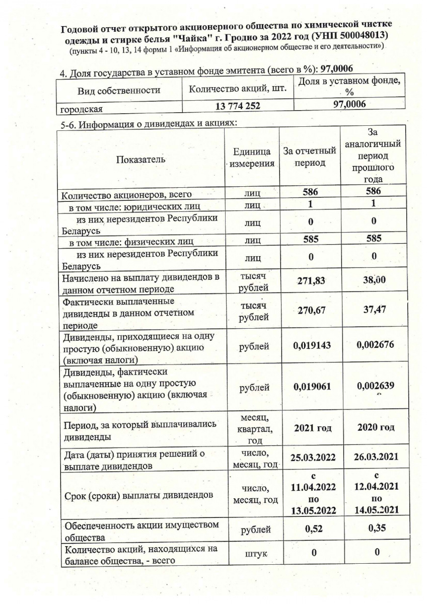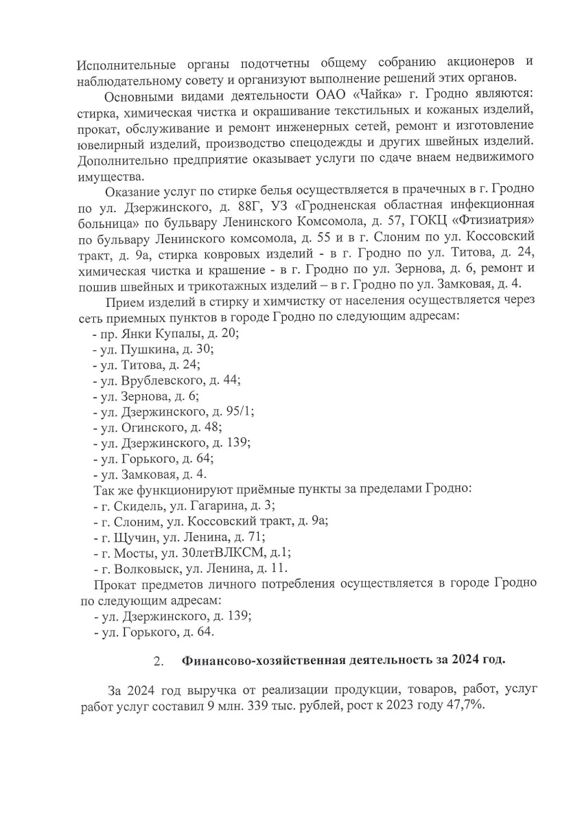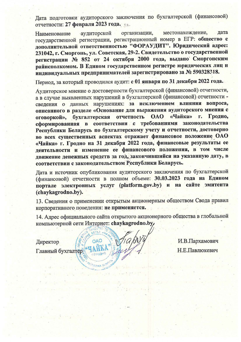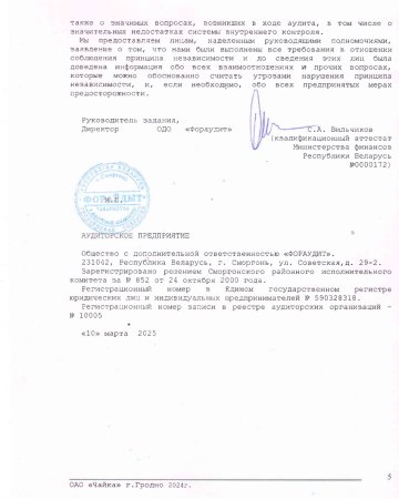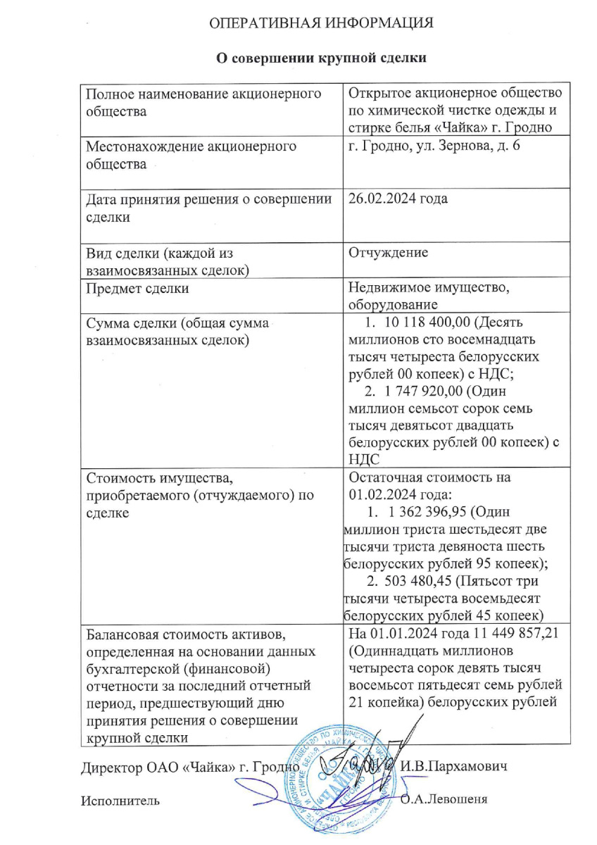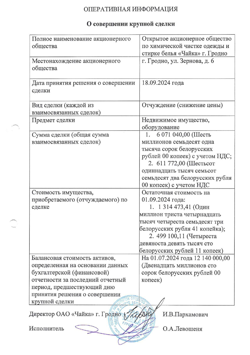 Информация для акционеров ОАО "Чайка" г. Гродно